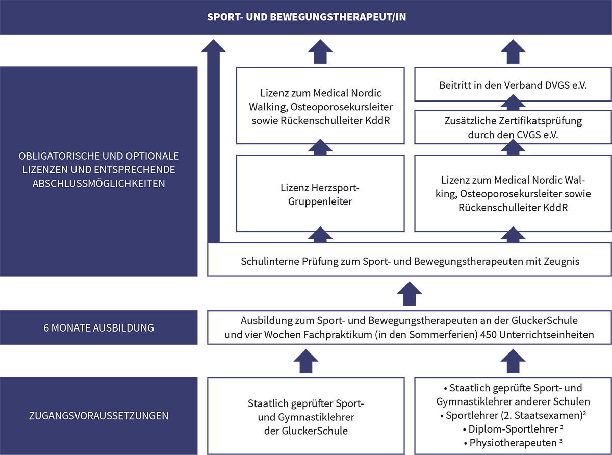 - Mit der Grundausbildung an der GluckerSchule deckt man bereits alle Zugangsvoraussetzungen, die vom DVGS e.V. zur Erlangung des Zertifikats „Sport- und Bewegungstherapeut nach DVGS e.V.“ gefordert werden, ab.